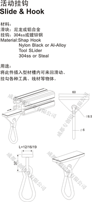 將此件插入型材槽內(nèi)可來回滑動、掛勾各種工具、線材等物體。